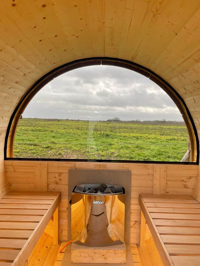 NOUVEAUTE 2026 : accès au sauna barrel avec vue sur la nature.